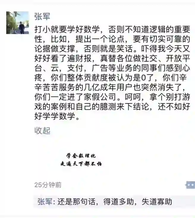 在全国人民欢度冬至吃饺子的大喜日子里,阿里公关与腾讯公关打起来了。阿里公关老大王帅说,腾讯的整条命都是小学生给的;腾讯公关总监张军立马发朋友圈,说王帅老师数学不好,我们鹅长还有广告等其他业务收入。