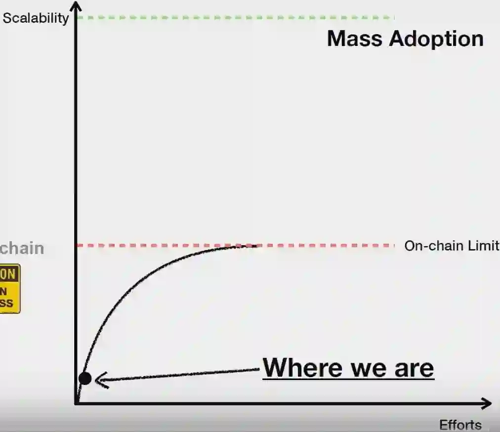 但正如这张图显示的,如果我们只关注 on-chain limit 的话,发展到一定程度后,我们的收益是递减的。说到底,区块链仍然是关于 “如何取得共识” 的一致性算法,而一致性算法不可避免地会遇到效率问题。如果说区块链技术大规模普及所要求的速度是最上面那根绿色的线的话,以现有方式的可扩展性是无法达到的。