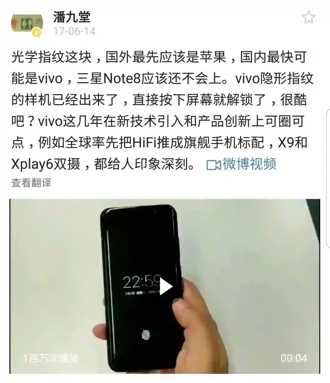 视频来自分析师@潘九堂,他在微博表示,国外最先使用光学指纹识别的应该是苹果,而国内则可能是 vivo。