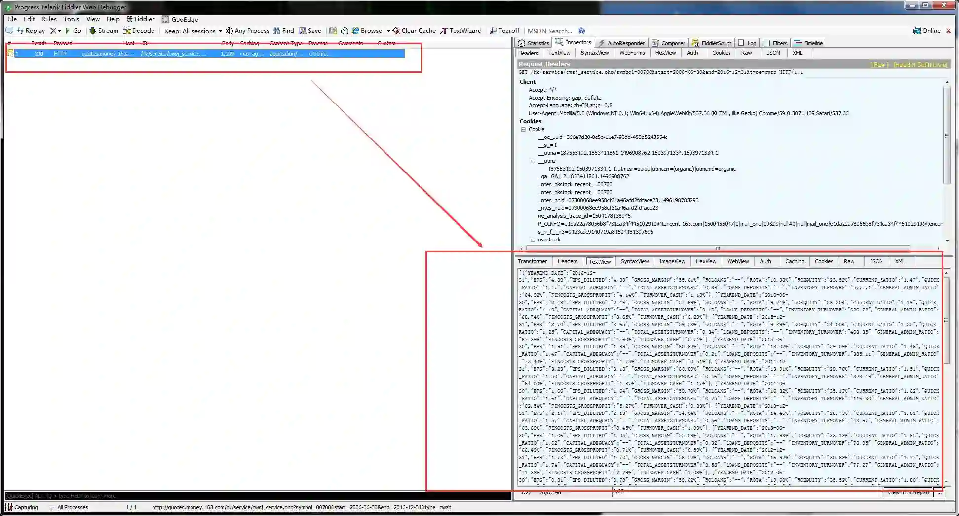 在时间选择框这里,我们可以获取到一共有哪些时间的财务报表。点击查询按钮,我们就可以进行查询,对点击主要财务指标的查询按钮这个动作,使用 Fiddler 进行抓包分析。