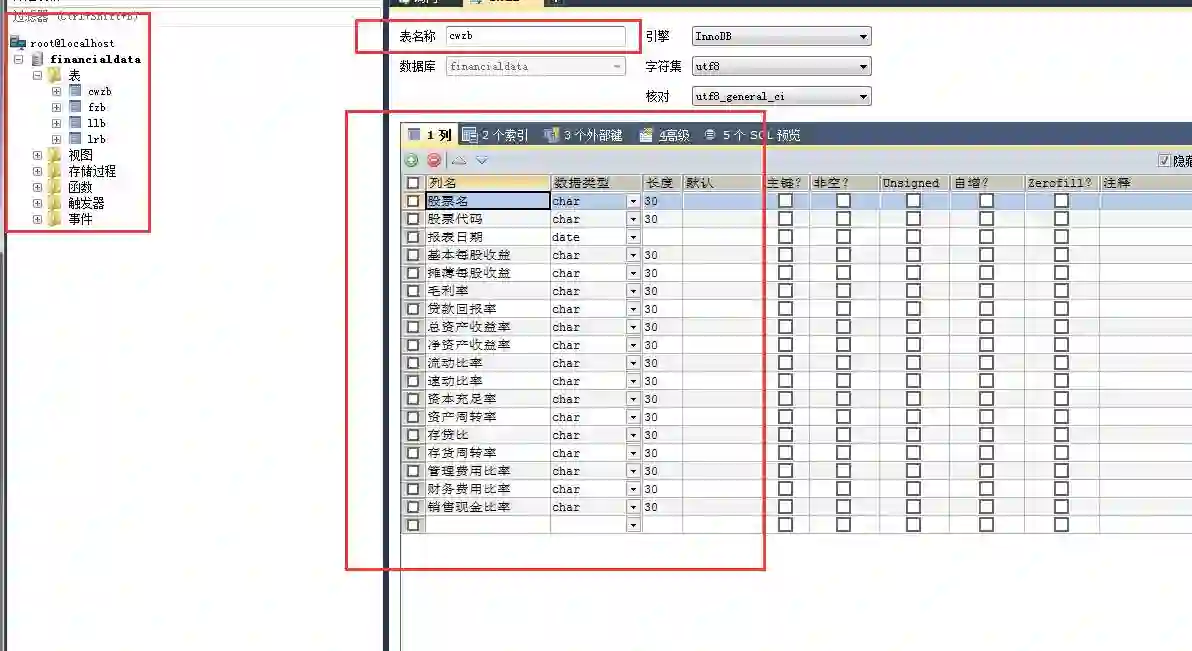 我们创建一个名字为 financialdata 的数据库,并根据网站情况创建四个表,分别为: