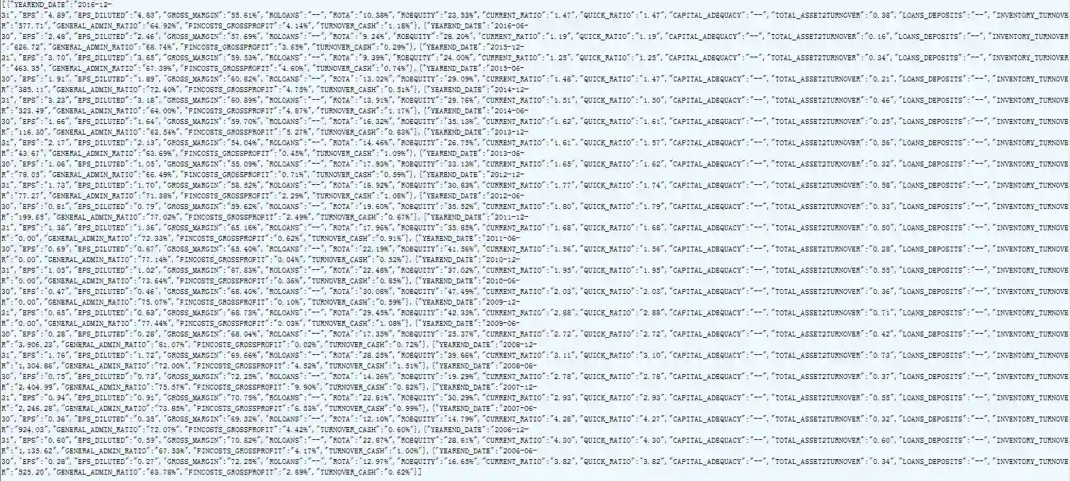我们可以看到,这个点击查询按钮,发送的请求地址和返回数据。从上图可以看出返回的数据是以 JSON 格式存储的。那么我们只要解析出这个 JSON 数据,就可以获得《主要财务指标》了。