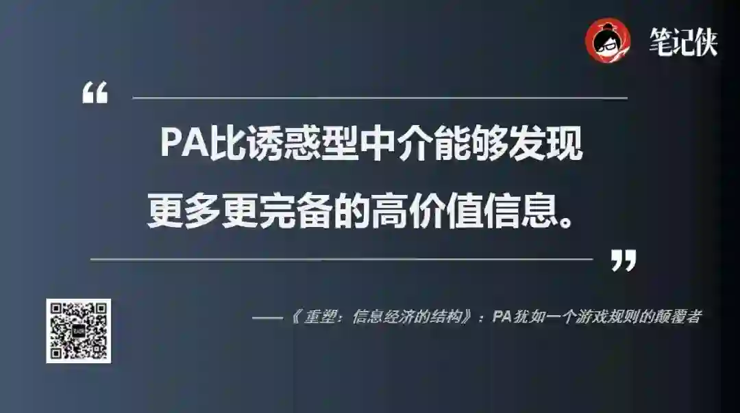 PA犹如一个游戏规则的颠覆者,成为记录我们的所有信息,并和我们一起管理我们的需求的值得信赖的伙伴,显然,PA比诱惑型中介能够发现更多更完备的高价值信息。
