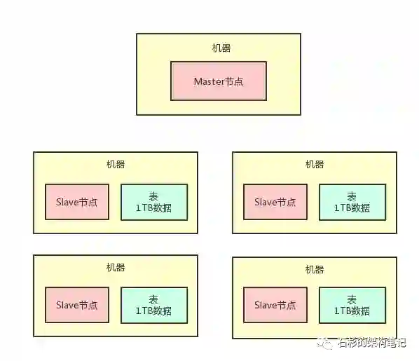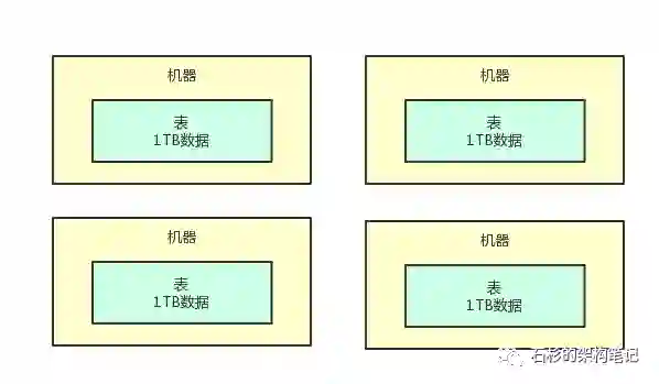 举个例子,比如总共 20TB 的数据,在每台机器上只要放 1TB 就可以了,1TB 应该还好吧?每台机器都可以轻松加愉快的放下这么多数据了。