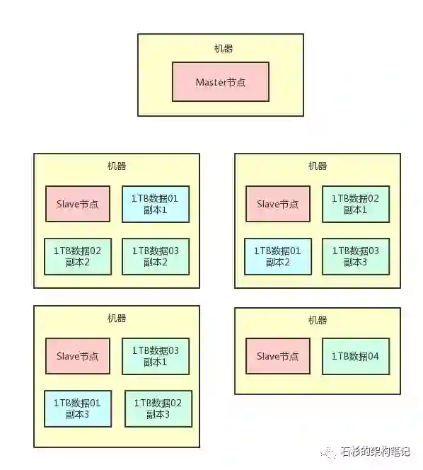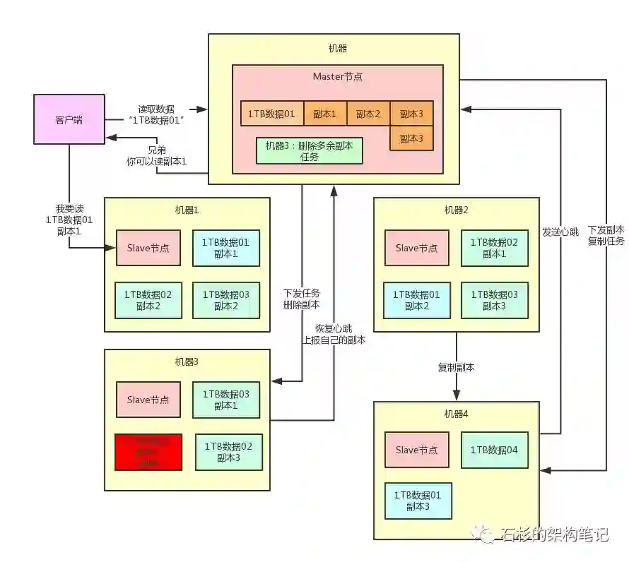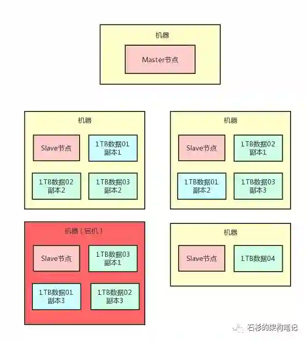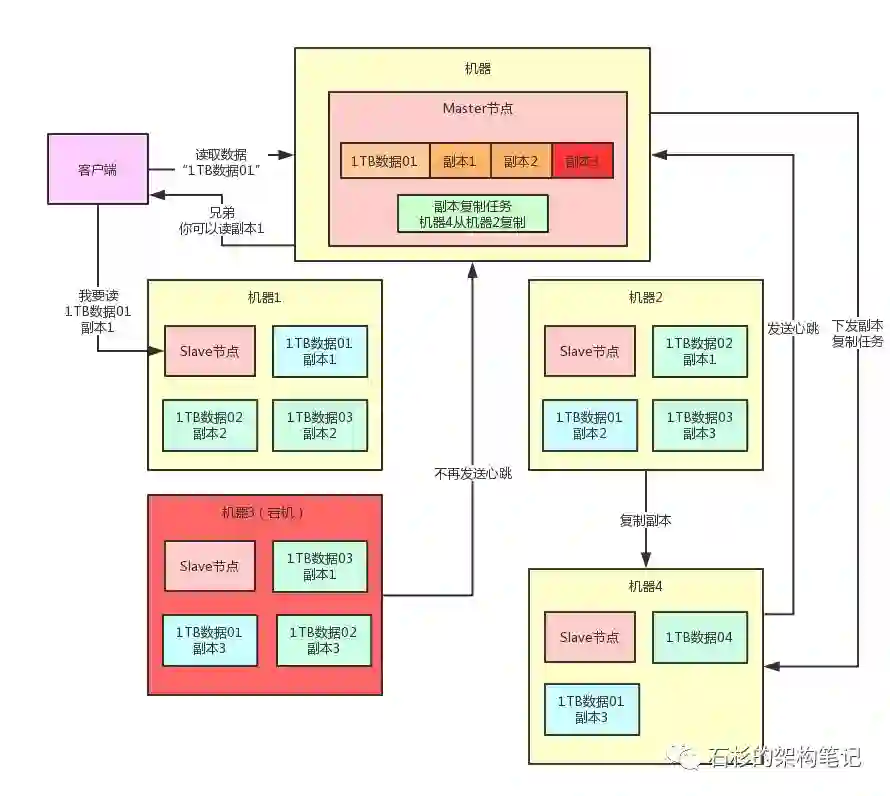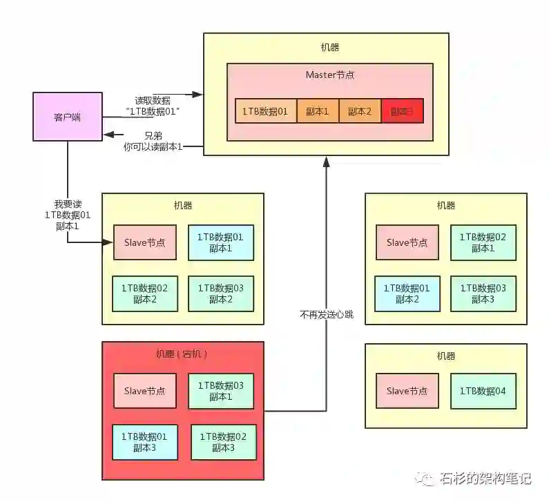 那么此时,Master 节点就可以通知人家去读“1TB 数据 01”的副本 1 或者副本 2,哪个都行,因为那两个副本其实还是在的。
