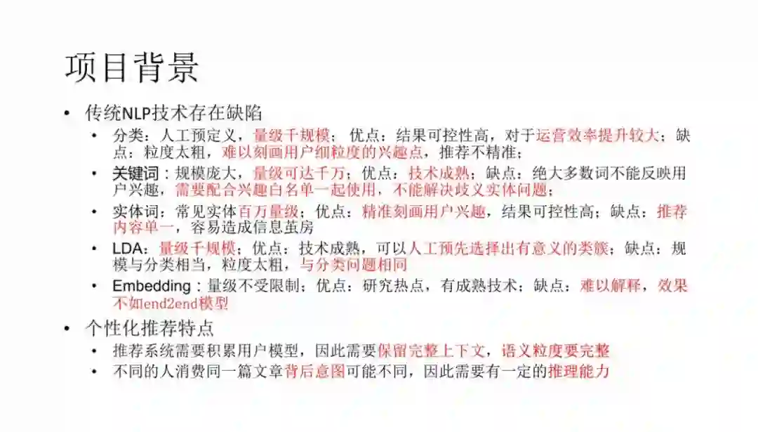 以上是整个项目的背景,我们总结一下。传统 NLP 技术存在缺陷: