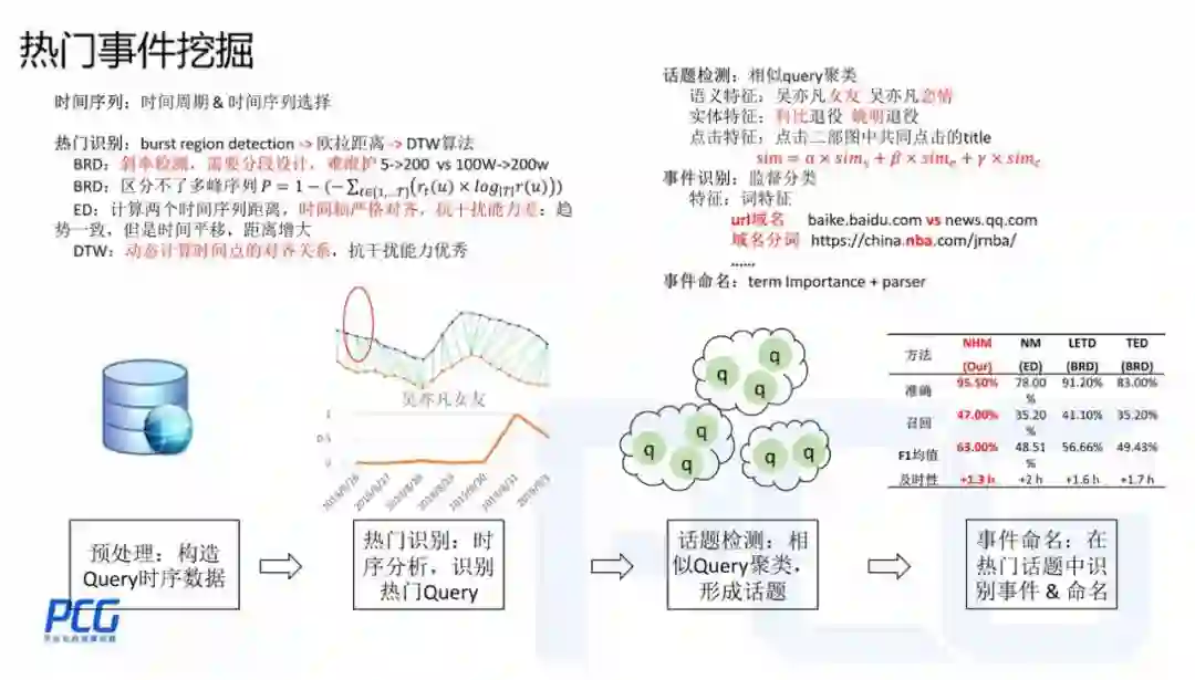 一个比较常见的方法是根据事件搜索量变化趋势判断,常规的做法是 BRD ( Burst Region Detection ),判断时间序列上是否有爆发点。但是 BRD 会遇到一些归一化,甚至多 point 的问题,于是我们采用了上图的方式克服上述问题: