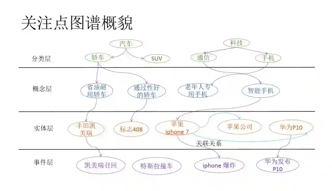 根据上述分析,我们提出了兴趣点图谱,用于解决上述个性化推荐中遇到的问题。兴趣点图谱由四层组成:分别为:分类层、概念层、实体词和事件层。下面分别介绍各层的内容: