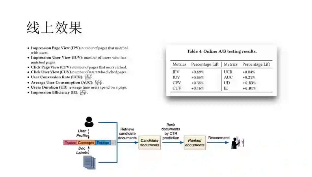 实验部分,baseline 是仅用传统的实体和分类标签,而实验组除了实体和分类以外,同时使用概念和事件类型的兴趣点,最后线上效果提升明显。