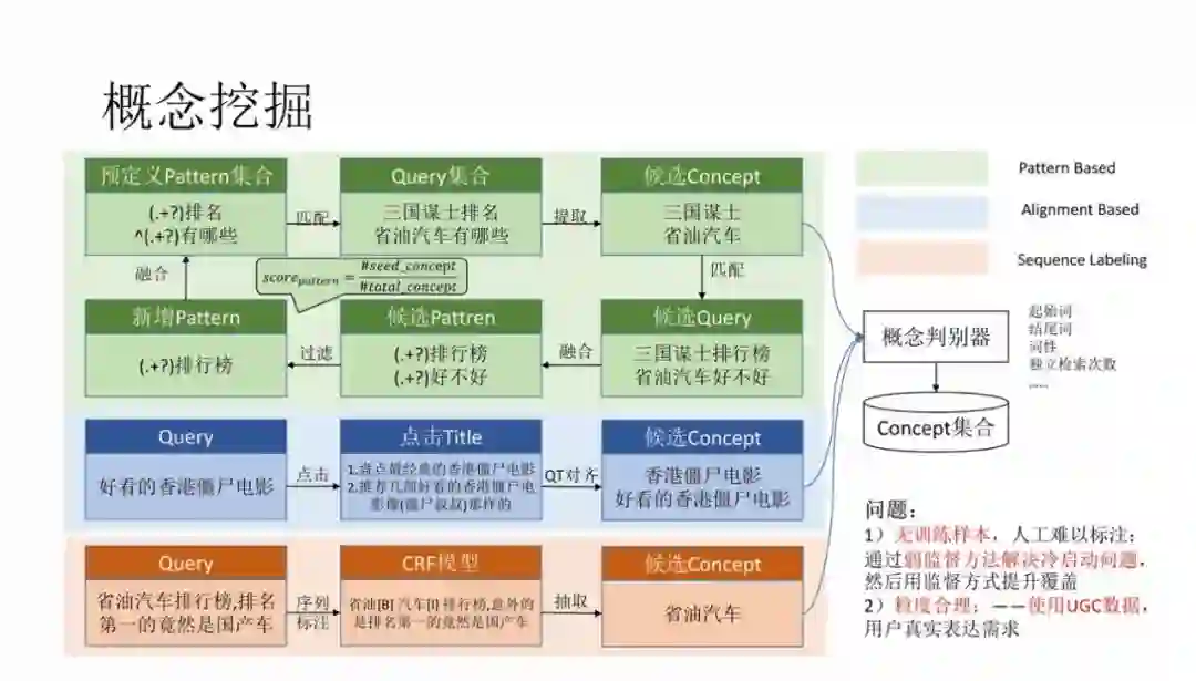 挖掘概念使用的是搜索数据,每一个概念都有多个点击的网页,对网页进行实体抽取,然后统计实体和概念的共现频次就可以获得较为准确的上下位关系,我们在 KDD 的 paper 中有详细的介绍,这里就不再重复。