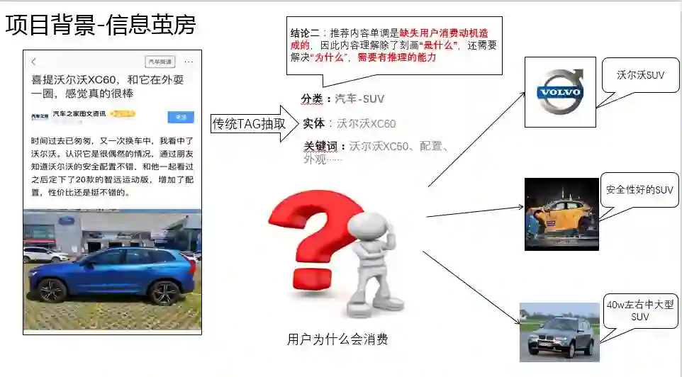 传统的内容理解仅仅解决了文章是什么的问题,但是对于用户 "为什么会消费" 却没有考虑。举个例子来说,如果我们的一个朋友看了一款 XC60 的汽车,我们会给他推荐什么内容呢?我们一定不会不停的推荐 XC60,而是会猜测朋友可能是喜欢沃尔沃这个品牌,比较看重安全性,或者对于空间有一定要求的 SUV。因此,如果要做好一个推荐系统,内容理解同样也需要相应的能力,挖掘用户真实消费意图。