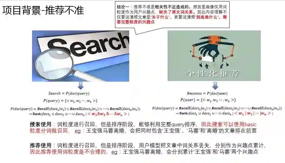 通过上述分析,我们可以得到这样的结论:搜索经过召回之后,排序有完整的上下文信息;但是在推荐中由于经过了用户画像,使用传统的内容理解方案时,排序会丢失用户阅读的上下文信息。因此,推荐对于内容理解需要保留完整的上下文,即把 "王宝强马蓉离婚" 当做一个完整的兴趣点,而不仅仅像搜索一样分别保留 "王宝强" 和 "马蓉"。