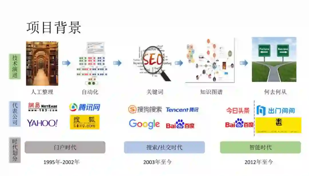 ③ 智能时代:2012年~至今,主要代表公司:今日头条、出门问问等。使用2012年来作为智能时代的开始,主要是这一年头条成立。头条定义了一种新的信息分发形式——个性化推荐。虽然个性化推荐技术早有研究,但是对于信息分发这个任务有不可或缺的推动作用。