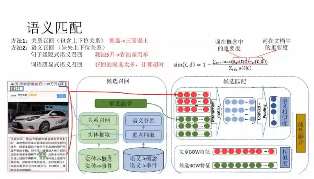 对于概念和事件类型的标签,原文中可能并不会出现,用抽取的方式就没有办法解决。我们采用召回+排序的方式解决。召回的逻辑分为关系召回和语义召回,其中关系召回会用到兴趣点图谱中的关系数据,召回 1-hop 内的节点作为候选,语义召回通过语义向量召回与 title 近邻的节点作为候选,然后用交互匹配的方式进行排序。如果 1-hop 内的节点数量太多,排序耗时会非常大,因此这里采用粗糙集的方式进行候选的粗排,缩小候选集合再进行排序。