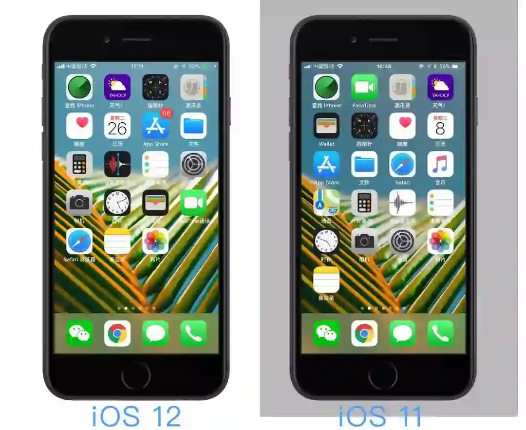 首先是升级后的桌面,明显提升了画面亮度,无论是眼睛看到的,还是截图,都可以看得出iOS 12的页面比iOS 11的页面更明亮,壁纸的蓝色亮度更高,以至于显得颜色稍浅,白色高光部分也更加明亮。
