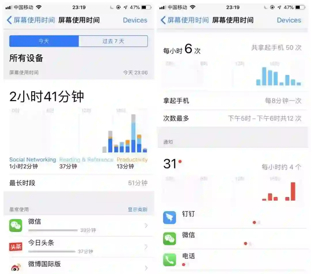 屏幕使用时间详情里,有各项关于手机使用的时间统计,统计数据对于一些手机重度使用者来说也许会比较有帮助。