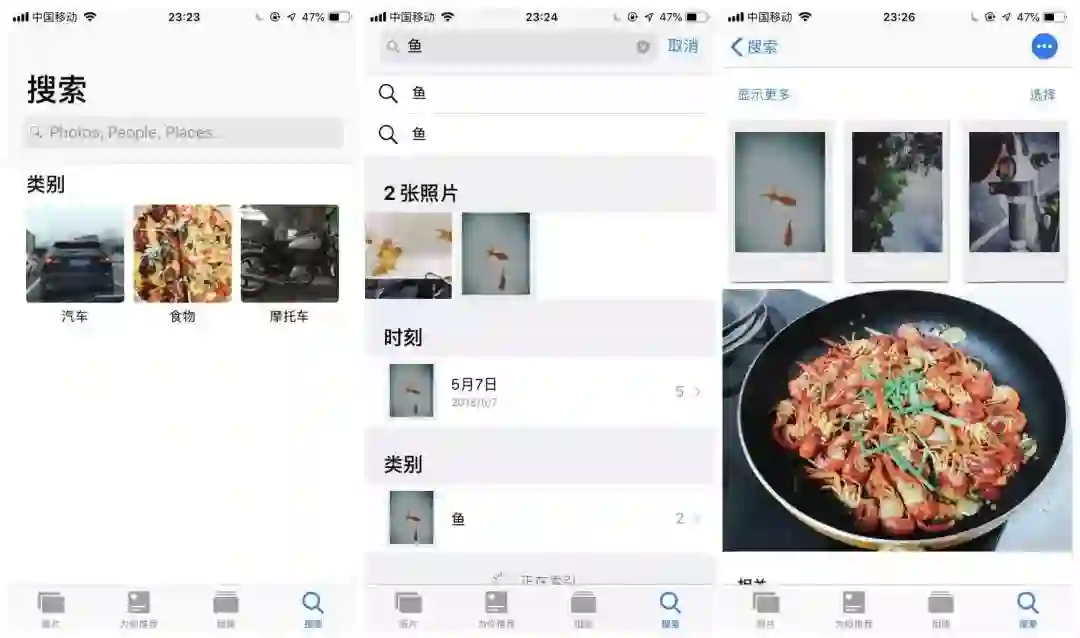 比如我在相册中以「鱼」作为关键字进行搜索,出现了我家金鱼的照片和视频。不过iOS 12对照片内容的识别也不是100%准确,比如我相册里命名就有花的照片,偏偏搜索不出来,所以苹果的AI技术还是需要一些调教。