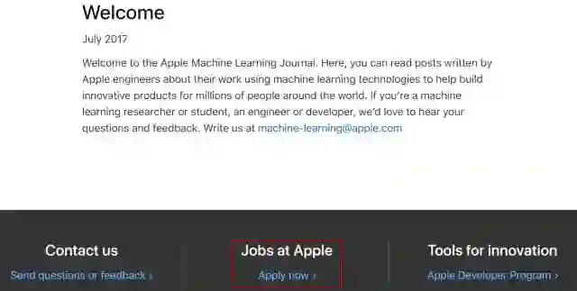 除此之外,AI科技大本营发现,在博客的底部,还有“ Jobs at Apple”一栏,显然,苹果希望通过这个平台招揽机器学习领域的人才。