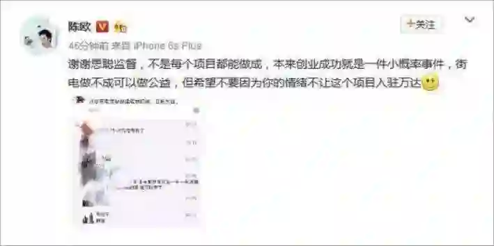 3个小时后,陈欧在微博隔空喊话,回复王思聪。他说:“谢谢思聪监督,不是每个项目都能做成,本来创业成功就是一件小概率事件,街电做不成可以做公益,但希望不要因为你的情绪不让这个项目入驻万达。”