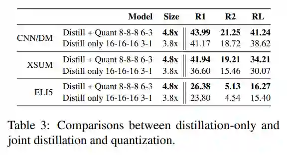 本文还将蒸馏感知的量化方法与仅采用模型蒸馏方法的模型表现进行了对比,如上表所示,本文提出的结合方法在文本摘要和问答任务上的表现更好。