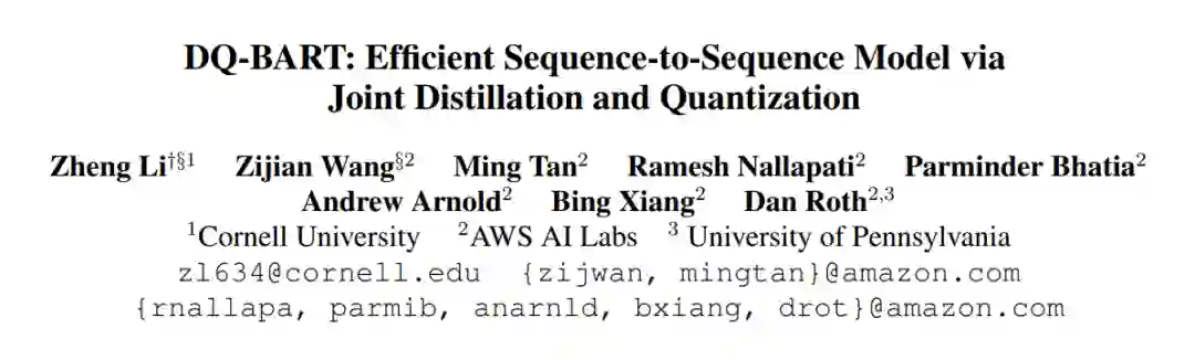 基于 Transformer 的预训练端到端语言模型(如 BART)极大地提升了一系列 NLP 任务的最新技术水平。然而,这些极其大规模的模型在资源受限的情况下的应用面临巨大挑战。针对这个问题,本文提出了 DQ-BART,一种联合蒸馏和量化的 BART 模型。经验结果表明,在