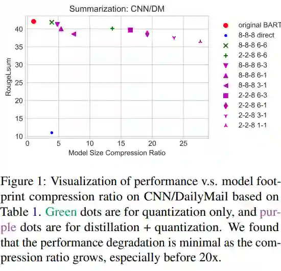 为解决这个问题,本文同时使用了模型蒸馏和模型量化两种方式,将 BART 模型压缩了 16.5 倍,在多个摘要和 QA 数据集上达到了与原模型相当的表现。