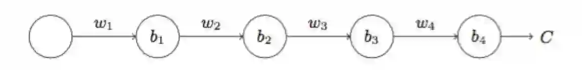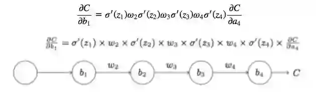 为了弄清楚为何会出现消失的梯度,来看看一个极简单的深度神经网络:每一层都只有一个单一的神经元。下面就是有三层隐藏层的神经网络: