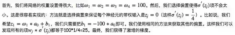 该导数在时达到最高。现在,如果我们使用标准方法来初始化网络中的权重,那么会使用一个均值为0标准差为1的高斯分布。因此所有的权重通常会满足