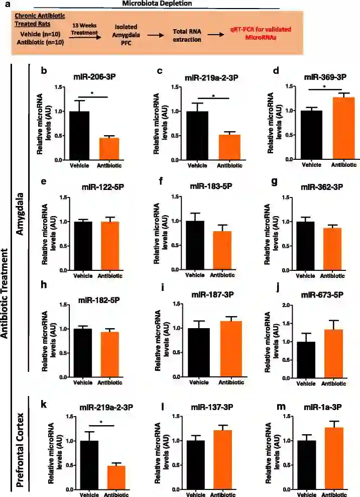 研究人员发现,与正常小鼠相比,不含肠道菌群的小鼠杏仁核103种miRNA的表达水平发生变化,前额皮质31种miRNA的表达水平发生变化。而在这些小鼠的饲料中添加了相应菌群后,小鼠前额皮质/杏仁核中的miRNA的水平则恢复正常。