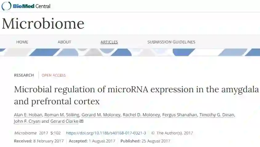 1.Alan E. Hoban et al, Microbial regulation of microRNA expression in the amygdala and prefrontal cortex, Microbiome (2017). DOI: 10.1186/s40168-017-0321-3