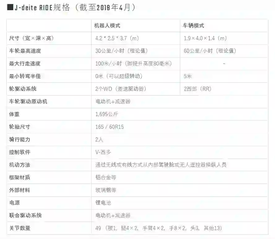 坐在驾驶席上操作,仅仅1分钟时间就可以变成高3.7米、宽4.2米的人形机器人。人形机器人步行时速为0.1公里,可以通过无线远程操控,可以用双脚行走。返回至汽车状态也极其简单。