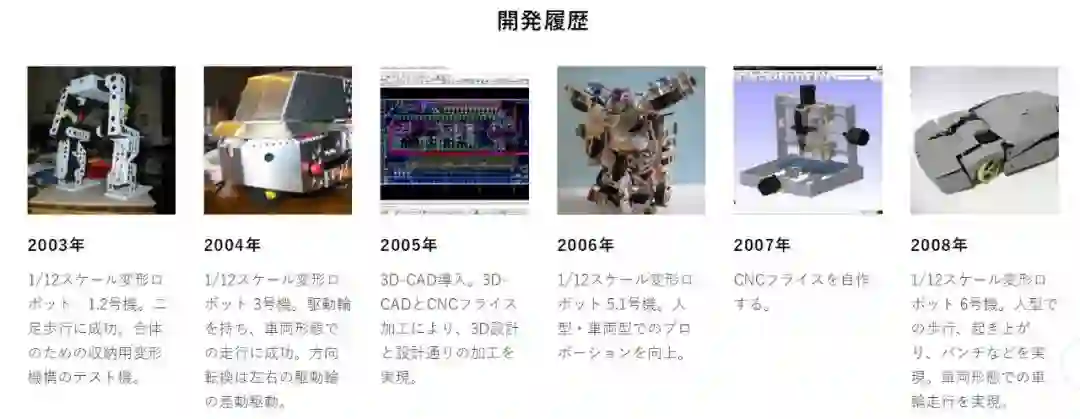 21岁完成小型两足步行机器人,那时他已经想到制造《变形金刚》一样可变身汽车的机器人,22岁机器人变形成功,又攻读了汽车工程技术。30岁完成第7代小型变形机器人。31岁辞职,创立「Brave Robotics」公司与机器人软件V-sido工程师吉崎航合作,开始制造第一个巨型变身机器人。