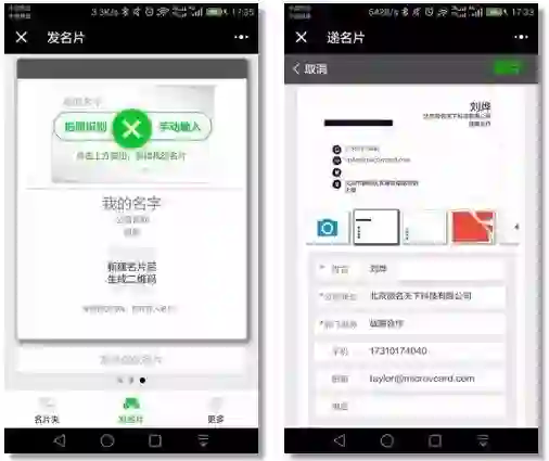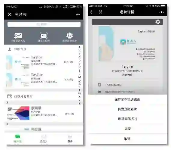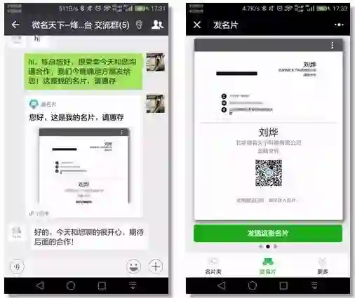 一键转发给个人或微信群。收发一张名片耗时2秒。对于收到的名片,用户还可以将信息保存到通讯录,一键拨打电话或者进行转发和删除的操作。如果对对方感兴趣,也可将自己的名片回发给对方。