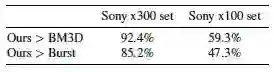 在处理具有挑战性的sony x300图片时得分高于基于BM3D和多帧处理的结果。在处理较为简单的sony x100图片时得分与基于BM3D和多帧处理的结果旗鼓相当