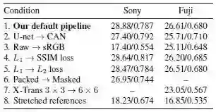 2.2 将输入由原始数据替换为sRGB输入,发现文章的处理流程对原始数据处理得到的结果优于对sRGB处理的结果。
