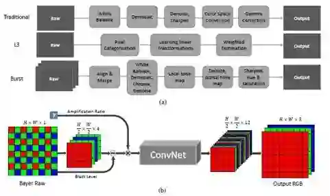 (a)从上至下分别是:传统图像处理流程,L3流程以及多帧图像处理流程(b)文章的流程