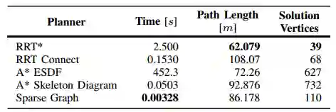 表 1 通过迷宫进行规划的定量结果,如图8所示。我们的方法(稀疏图)比RRT *的初始解决方案快800倍,甚至比RRT Connect快50倍。它产生稍长的路径,因为它绑定到最大间隙图。