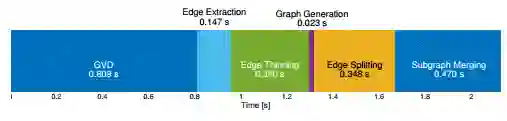 图 1 生成骨架图(这是一个密集的体素网格)的步骤的系统图,并从那里得到的稀疏图(这是一个带有直线边的无向图)。步骤的一般顺序是生成空间的广义Voronoi图(GVD)或中轴,提取其边和顶点,细化图,然后沿着图中的边创建稀疏图,并重新连接最终图中的断开连接的子图。