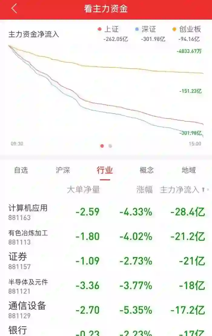 计算机应用、有色冶炼加工、证券板块称主力资金流出重灾区,分别净流出28.4亿、21.2亿、21亿元。