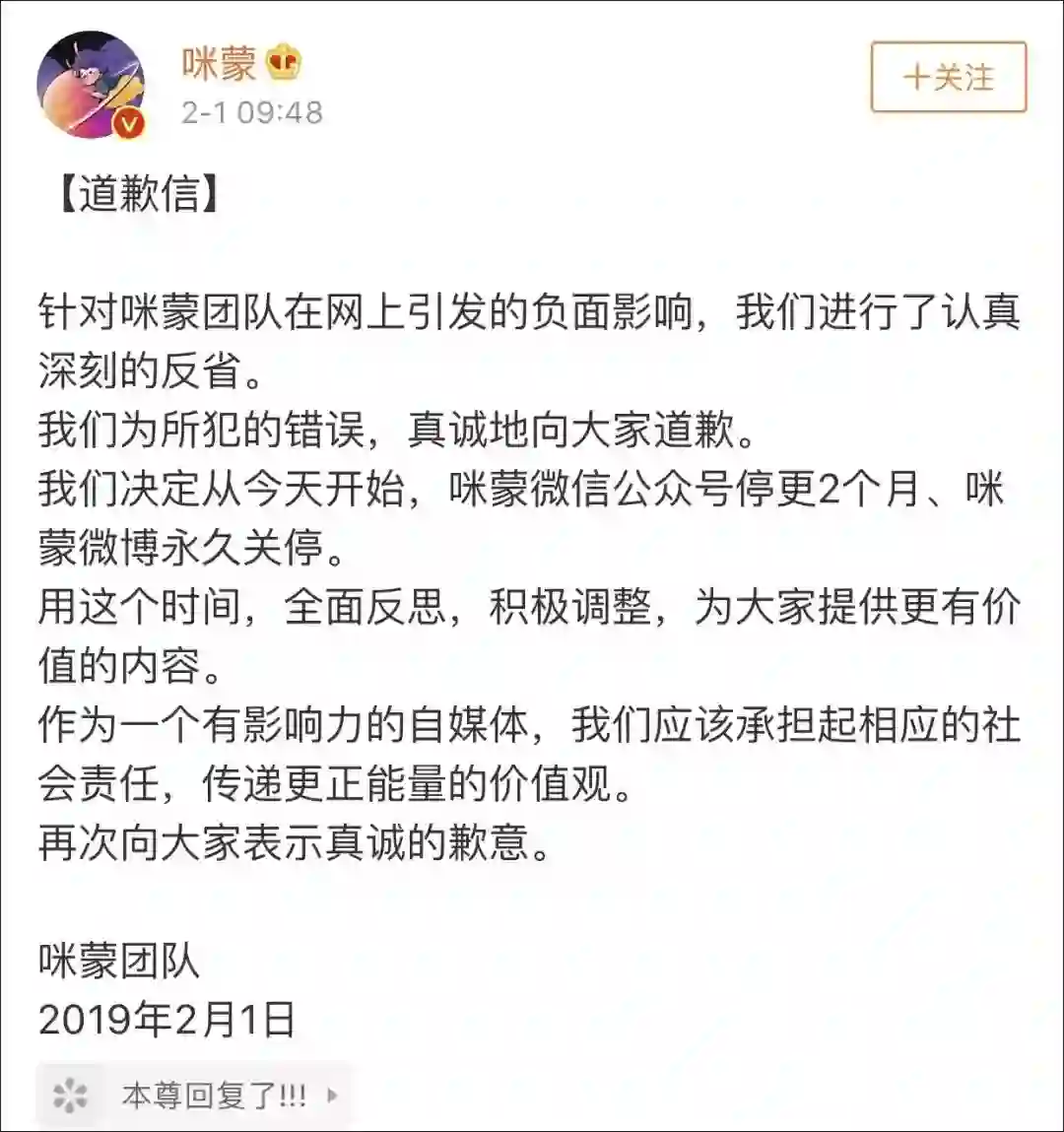 除了道歉,咪蒙团队还自己进行了账号“关停”。咪蒙团队称,“我们决定从今天开始,咪蒙微信公众号停更2个月、咪蒙微博永久关停。”其表示,将用这个时间,全面反思,积极调整,为大家提供更有价值的内容。