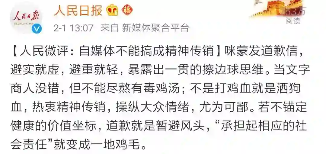 今天人民日报官方微博发文评论咪蒙的道歉信,称:自媒体不能搞成精神传销。