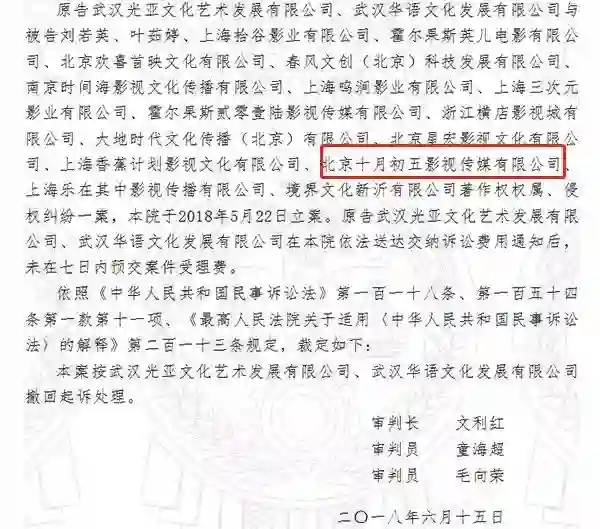 在一份武汉光亚文化艺术发展有限公司、武汉华语文化发展有限公司等与刘若英等著作权权属、侵权纠纷一审民事裁定书中,北京十月初五影视传媒有限公司为被告之一,该案于2018年5月22日立案,2018年6月15日,案件按原告撤回起诉处理。