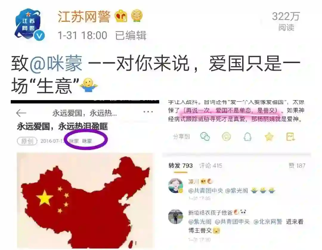 昨晚,@江苏网警直接点名咪蒙,前者批评其将爱国当做“生意”。