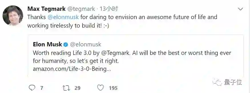 在推特上,Tegmark曾多次和马斯克互动,称赞马斯克“敢于设想一个美好的未来,并不知疲倦地努力去建造”,并反复表示了对人工智能的担忧和对自己新书反响的关注。