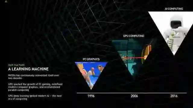 从这个图可以简单看一下公司的发展,从最早的游戏卡到专业GPU加速到后面的AI计算,这个图简单讲了英伟达的发展过程,也说明了我们公司现在是站在了AI计算比较有力的位置。
