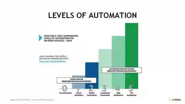 既然讲到自动驾驶,我们有一个简单的概念,就是自动驾驶的等级。SAE有五个等级,从2级以下主要指的还是ADAS,也就是辅助驾驶的市场。从3级是真正开始自动驾驶的市场,当然这是人还在坐在驾驶的位置,然后车去驾驶。