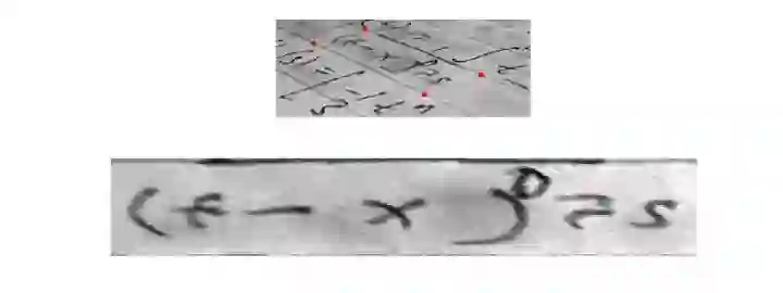 使用投影变化,可以将上面的图像进行扭曲处理,上图中的 4 个红点会组成一个矩形,从而将红点围住的文本「拉直」。Mira 团队在将眼部照片进行正常化处理时,应用了同样的方法。