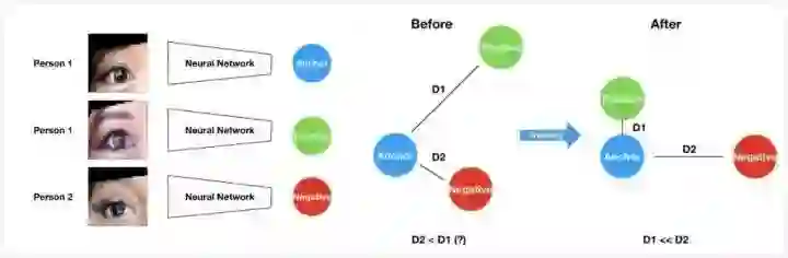 通过使用上面神经网络的预训练权重,研究人员又采用了新的损失函数,该函数将多组嵌套的平均值放在极为相近的位置(相对于无关个体),如下所示: