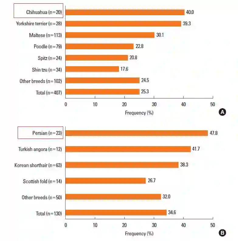 这张图看起来对吉娃娃和波斯猫过敏的人比较多,当然也可能是因为养的人多 | Yang MS et al. / Allergy, asthma & immunology research(2018)