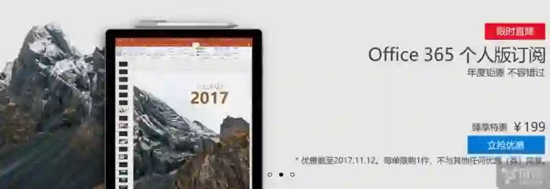 今晚就是双十一之夜了,不知道各位的购物车是不是都已经塞满了呢?这个时候小编就得为大家的钱包再“着想”一下了,其实除了衣食住行方面的商品之外,我们平时使用的很多重要软件也有大幅度的折扣哦!今天为大家找到的就是微软 Office 365 个人版的活动,从现在到11月12日,原价399元的 Office 365 订阅只需要199元!